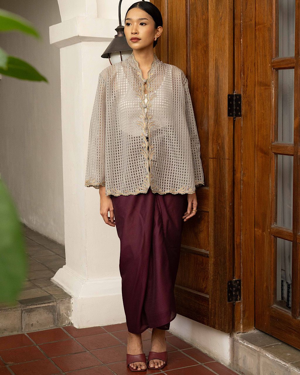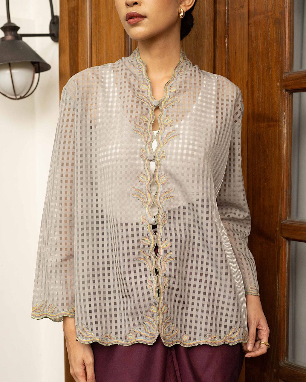 Made from lightweight organza checkered pattern, this top features intricate floral embroidery along the front and hem. Lightly structured, it complements a soft-toned skirt, refined look that blends modern sophistication with traditional charm.