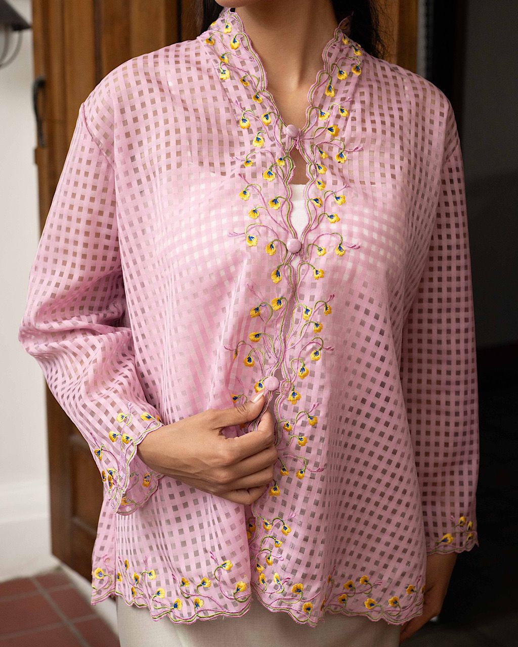 Made from organza checkered pattern, this top features intricate floral embroidery along the front and hem. Lightly structured, it complements a soft-toned skirt, refined look that blends modern sophistication with traditional charm.